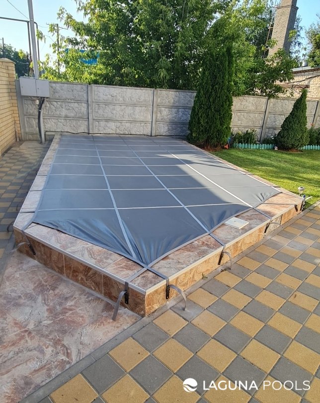 Прямоугольный бассейн с защитным тентом и плиткой